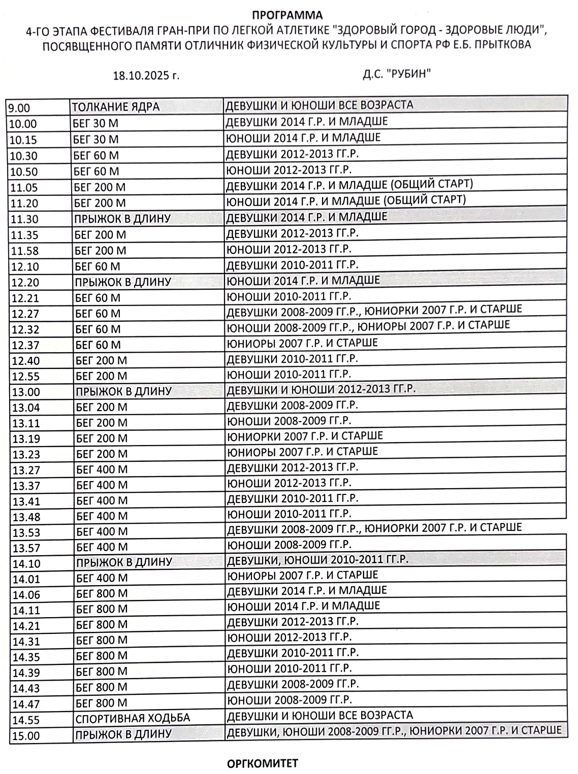 Дистанции: 800 м (101 участник), 400 м (88 участников), 200 м (426 участников), 60 м (272 участника), 30 м (154 участника), спортивная ходьба 3 км (3 участника), спортивная ходьба 2 км (3 участника), спортивная ходьба 1 км (7 участников), прыжок в длину (84 участника), толкание ядра (27 участников)